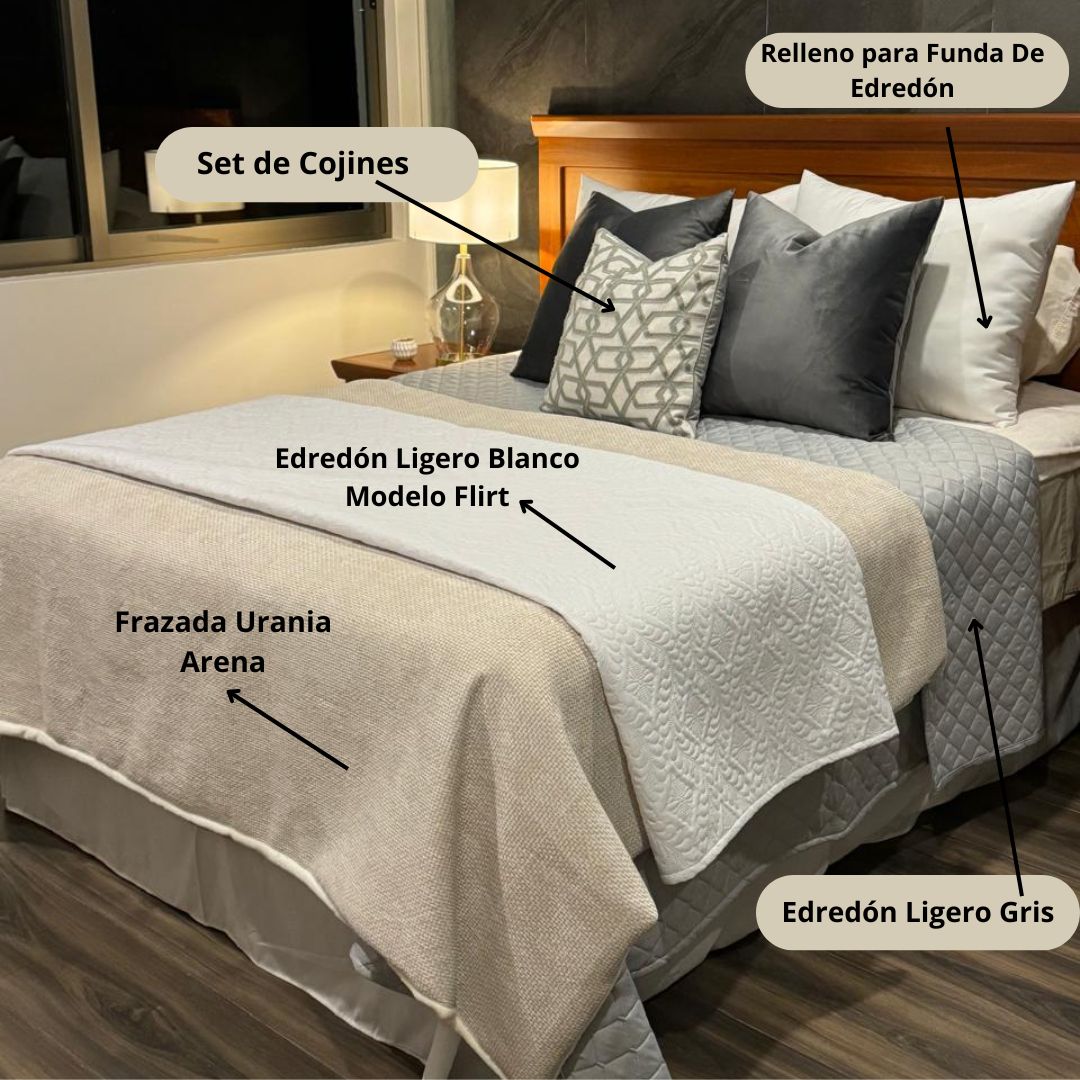 Incluye edredón y 2 fundas decorativas de microfibra tacto algodón super soft.